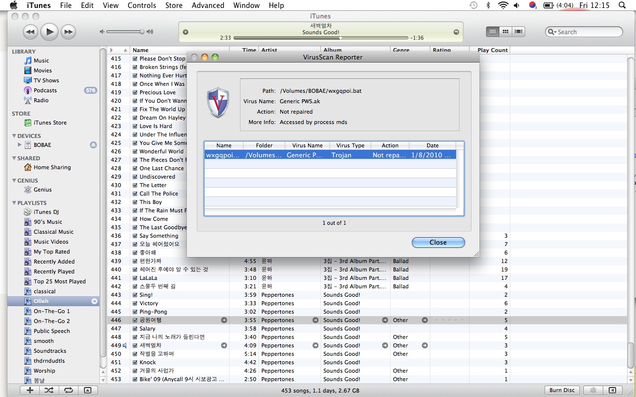 정리를 하면, VirusScan 프로그램 등과 같은 바이러스 상시 감시 프로그램은 사용을 하지 않는 것이 좋을 듯하며 추천하는 유틸리티를 사용하여 완전 삭제를 진행해 보시고, 지금 메시지 상에 나타나 있는 바이러스는 OS X용 바이러스는 아니라는 것입니다.