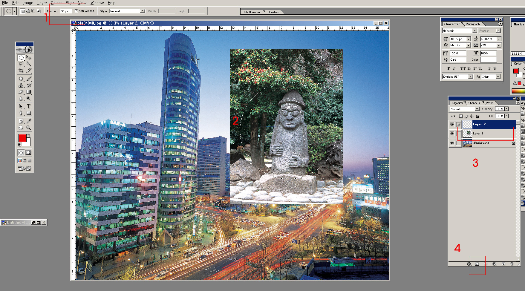 첫번째는 제가 설명한 방법이구요 두번째는 그라데이션+마스킹레이어로 하는 방법이 있구요. 세번째는 위에 2번 과정에서 선택하신다음에 샐랙트 메뉴에서 인버트 하시고 델리트 하시는 방법도 있어요.그런데 이방법은 추후 수정이 불가하기때문에 제가 설명해 드린 방법으로 하시고 레이어 마스크를 수정하시면 되요...
